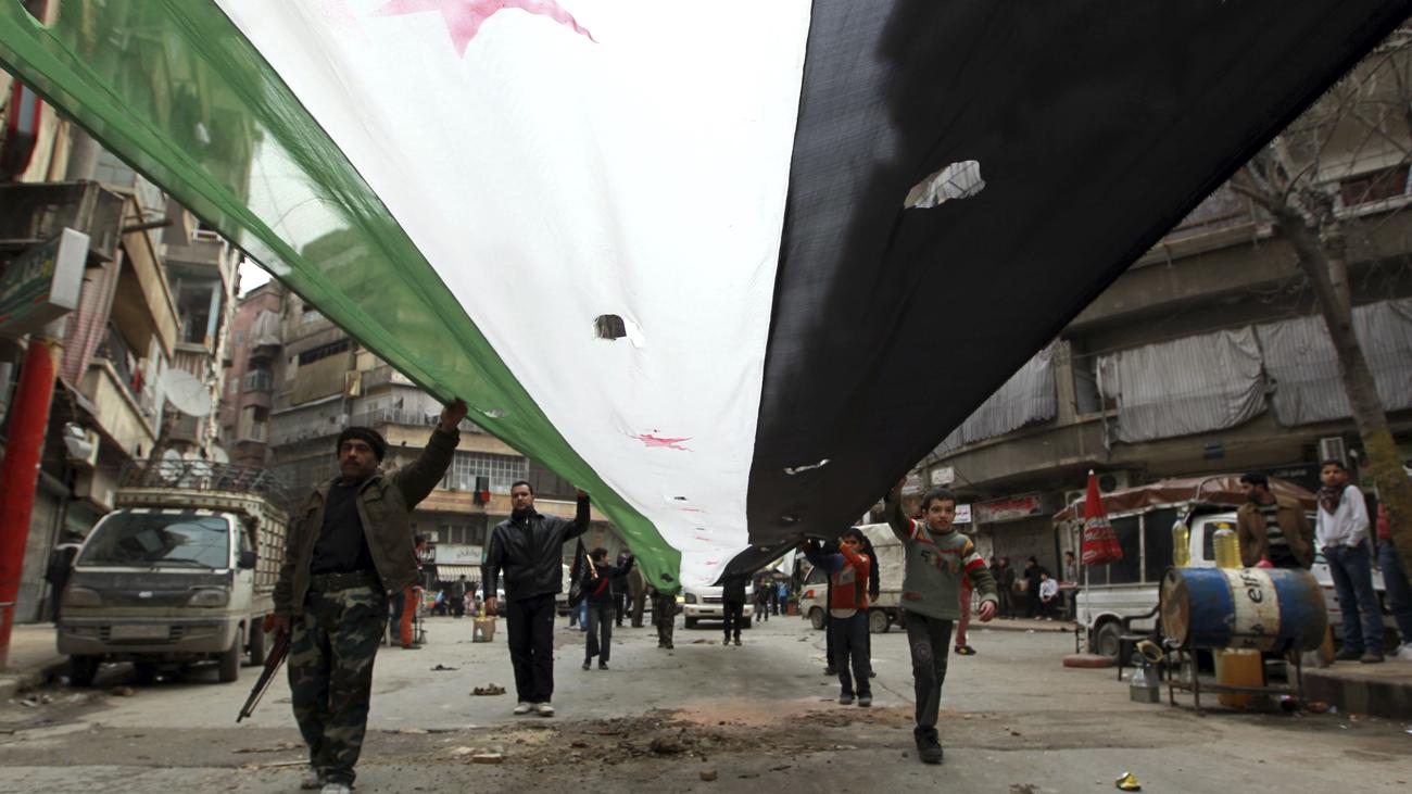 Demonstranten in Aleppo tragen eine Flagge der syrischen Opposition.